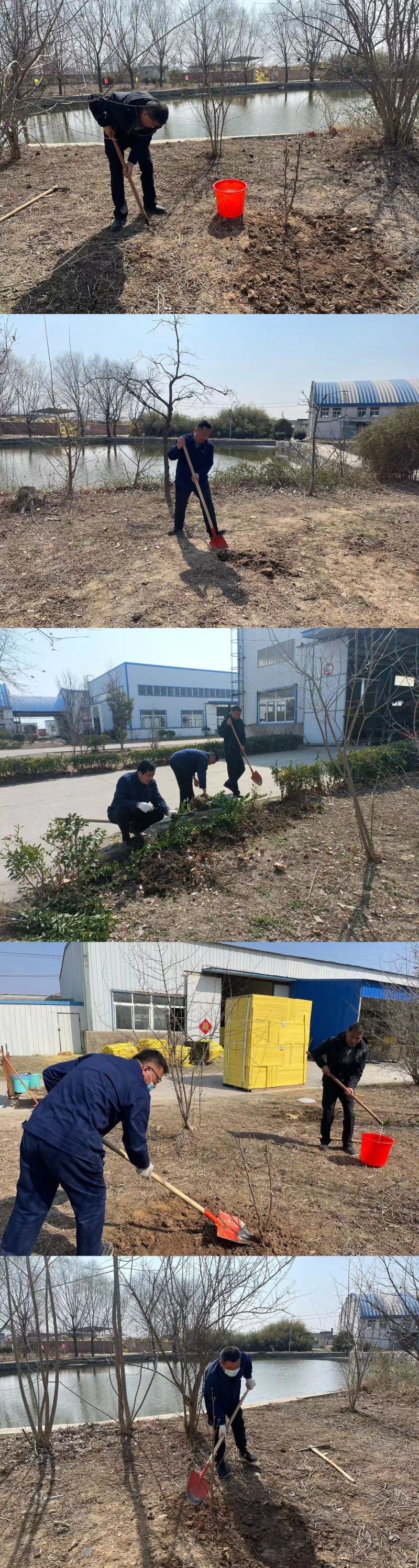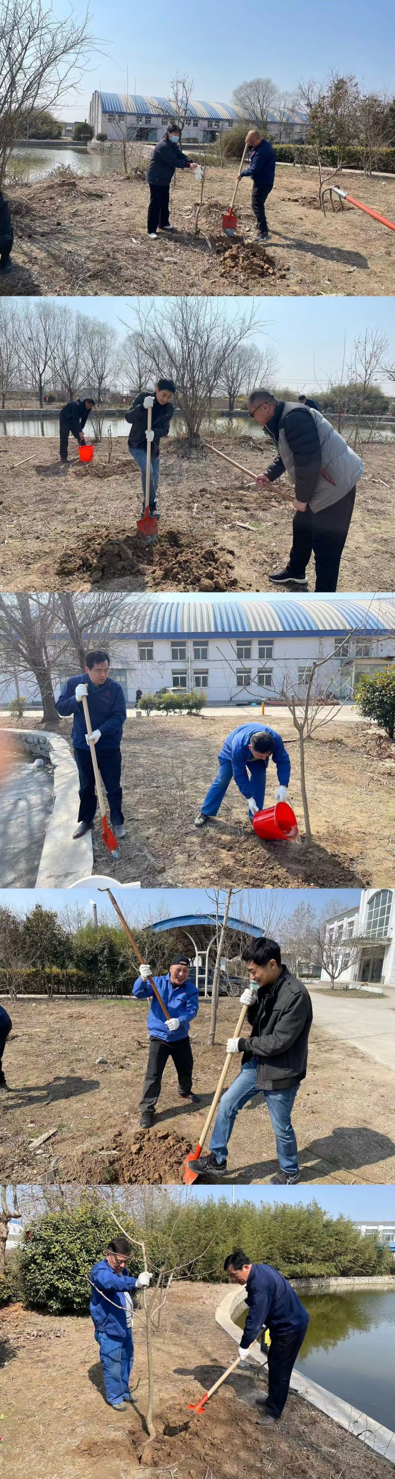 活動(dòng)現場(chǎng),大家擼起袖子,拿起鐵鍬、鋤頭等工具,個(gè)個(gè)熱情洋溢、干勁十足,一派緊張有序的勞動(dòng)景象。他們三五人一組,分工明確,團結協(xié)作,不一會(huì )兒,空地上挖出了一個(gè)個(gè)樹(shù)坑,接著(zhù)把樹(shù)苗放到坑里,一邊扶著(zhù)樹(shù)苗,一邊鏟土填坑,待樹(shù)苗基本能保持平衡豎立,才松開(kāi)樹(shù)身,最后提水澆苗,培上一層干土,整個(gè)過(guò)程一絲不茍,各個(gè)環(huán)節銜接有序、配合默契,確保每一棵樹(shù)苗都能成活。經(jīng)過(guò)一上午熱火朝天的勞動(dòng),新種植的30余顆花果樹(shù)、百株冬青,在春日里迎風(fēng)挺立,展現出盎然生機。