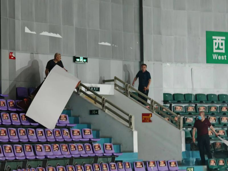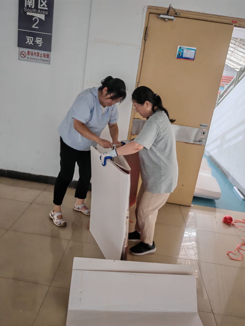 物業(yè)公司黨員干部及職工在館內酷熱的環(huán)境下,積極投入清掃工作中,分工合作,有的負責摘除過(guò)期廣告牌、有的負責清運廣告牌、有的負責鏟除墻體雙面膠、有的負責清理平臺衛生、有的負責粘貼區域標志,嚴格實(shí)行不間斷的巡回式清理,不放過(guò)任何一處衛生死角。經(jīng)過(guò)大家一上午的努力,體育館內部環(huán)境煥然一新。