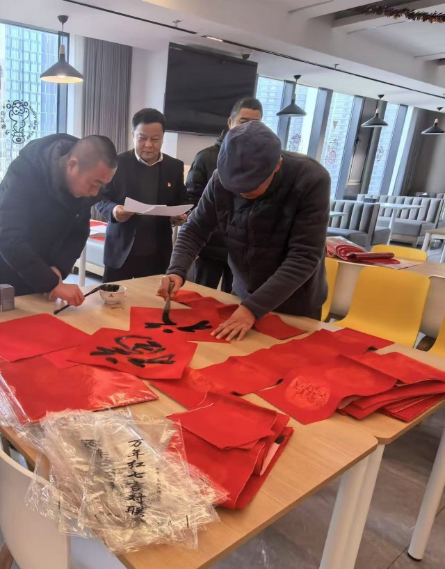 “歲歲平安如意到,年年吉祥福星高”“新春福旺鴻運開(kāi),佳節吉祥如意來(lái)”……活動(dòng)中,江蘇省書(shū)法家協(xié)會(huì )會(huì )員胡樹(shù)森老師揮毫潑墨、筆走龍蛇、氣韻生動(dòng),一幅幅平安和諧、寓意吉祥的春聯(lián)和“?!弊周S然紙上,職工們邊欣賞、邊拍照,手持春聯(lián),喜笑顏開(kāi)。大家互相討論著(zhù)各副春聯(lián)的蘊意,紛紛表示這是送到心坎里的新春祝福,也給即將到來(lái)的新春增添了濃濃的年味。