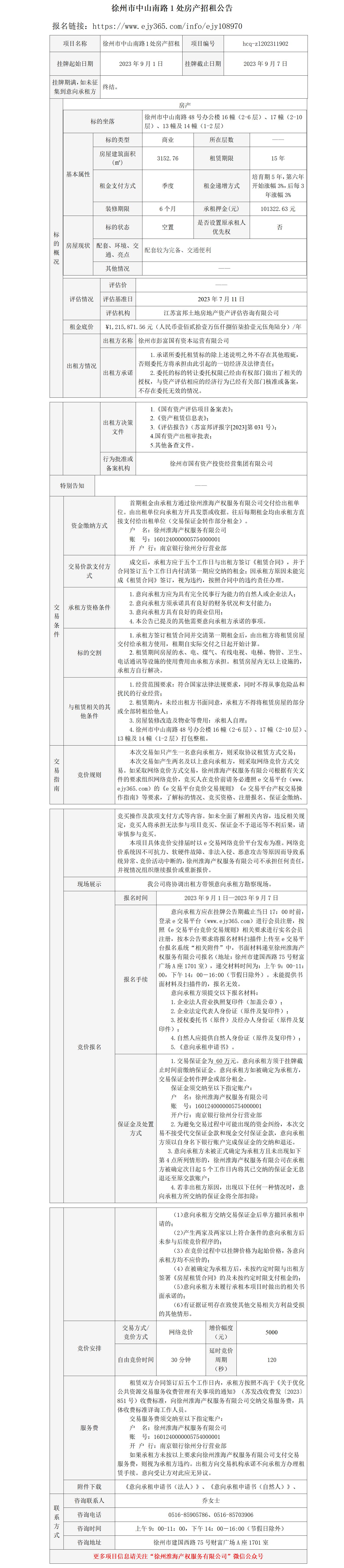 江蘇省徐州市云龍區中山南路65號輕工大樓808招租公告