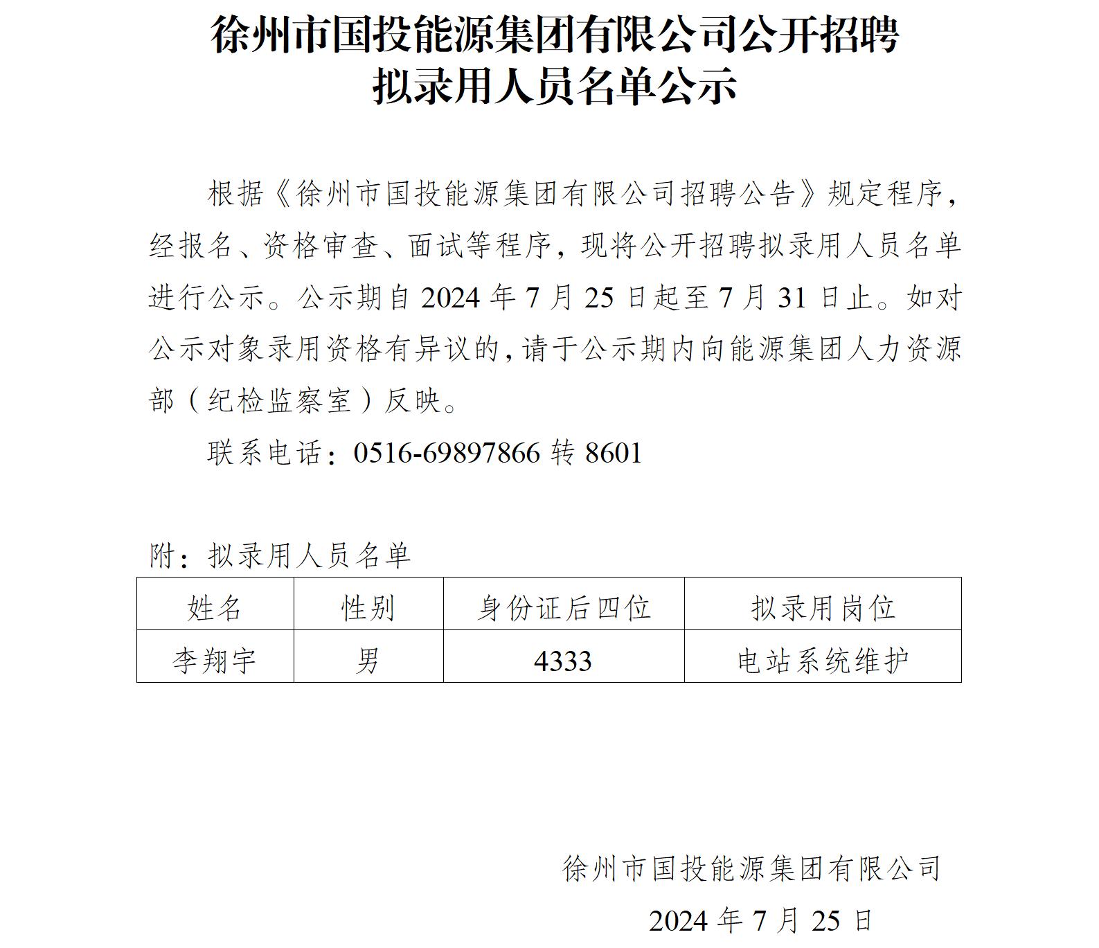 徐州市國投能源集團有限公司公開(kāi)招聘擬錄用人員名單公示