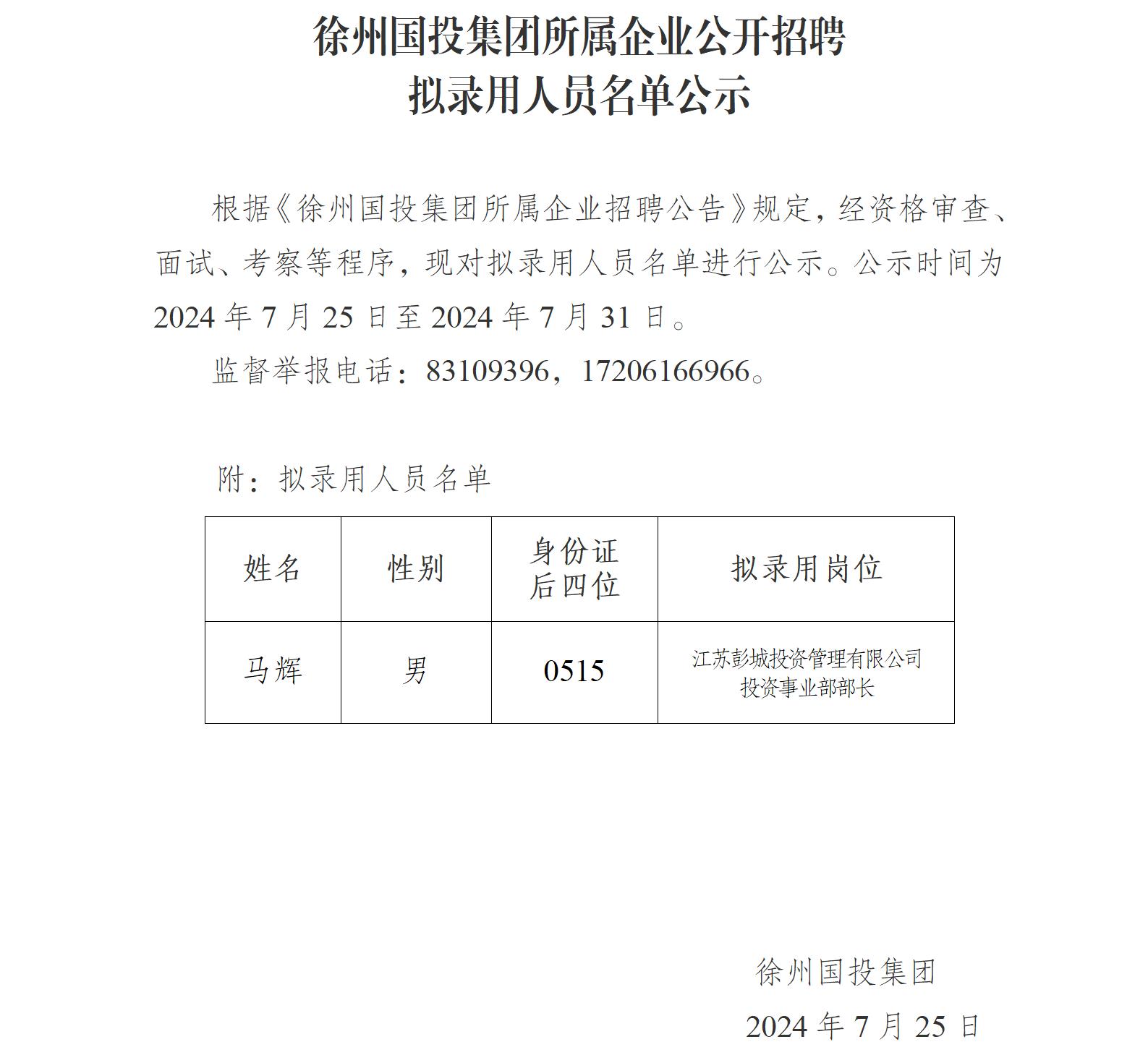 徐州國投集團所屬企業(yè)公開(kāi)招聘擬錄用人員名單公示