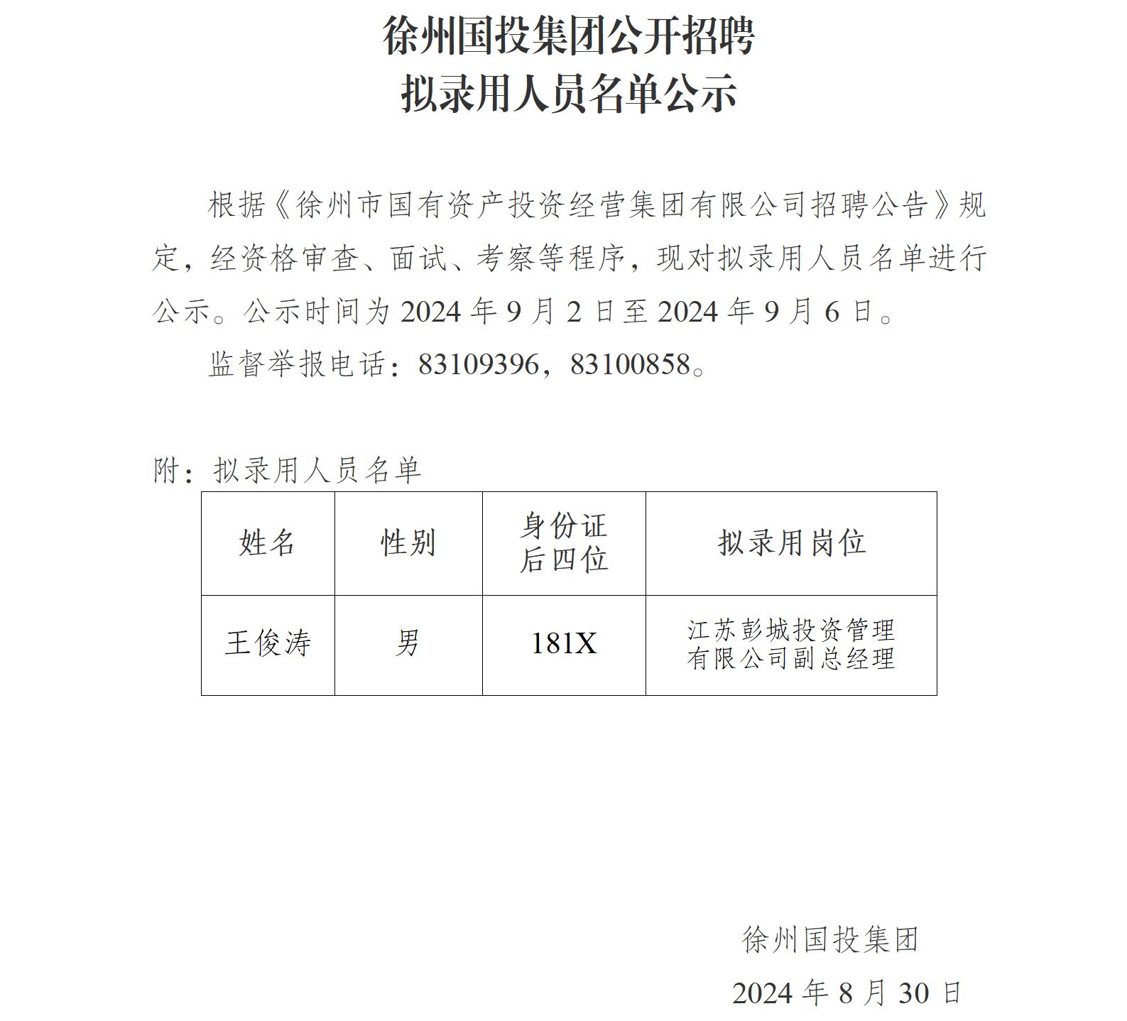 徐州國投集團公開(kāi)招聘擬錄用人員名單公示