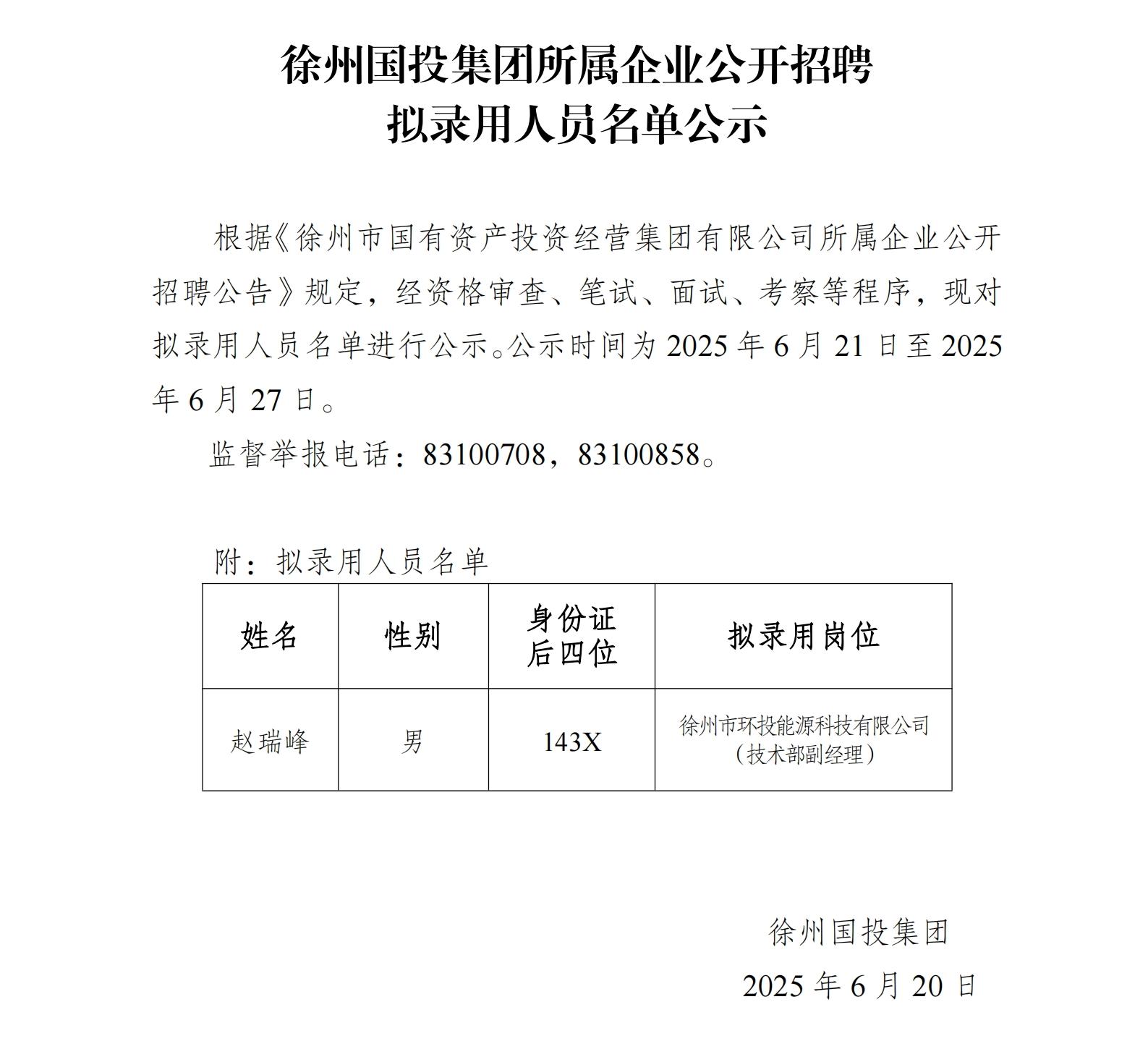 徐州國投集團所屬企業(yè)公開(kāi)招聘擬錄用人員名單公示