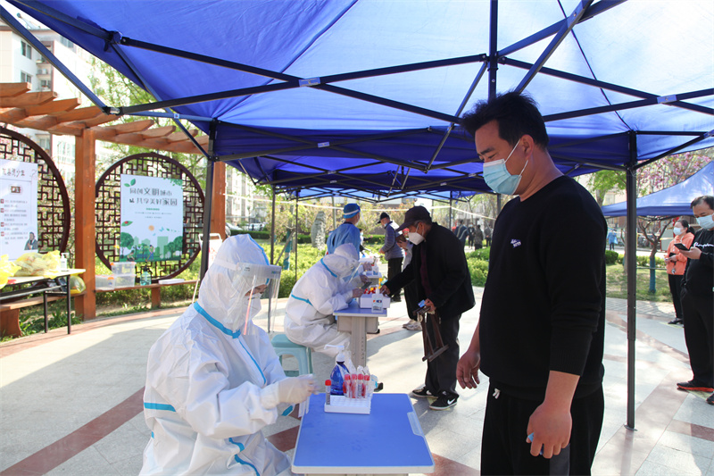 盡銳出戰,黨群勠力同心。9日早上5點(diǎn),天色朦朧中,黨員帶領(lǐng)所有工作人員已到達指定采樣點(diǎn),開(kāi)始做采樣前的準備工作,6點(diǎn)鐘采樣準時(shí)開(kāi)始。四月的早上與中午溫差大,采樣人員穿著(zhù)單薄,早上冷風(fēng)襲來(lái),有的人皮膚上起了蕁麻疹,不敢用手去撓;中午在太陽(yáng)的炙烤下,防護服下的衣衫早已濕透,只能忍著(zhù)。即使再辛苦,她們沒(méi)有一聲怨言,有的是戰勝病毒的決心。黨委班子成員下沉一線(xiàn),奔波于各采樣點(diǎn)進(jìn)行巡查、指導,慰問(wèn)大家。黨員同志在采樣中充分發(fā)揮模范帶頭作用,以實(shí)際行動(dòng)帶領(lǐng)大家?jiàn)^力作戰。入戶(hù)人員穿著(zhù)防護服深入社區,一上午要爬幾十層樓,為行動(dòng)不便的老人采樣。后方陣營(yíng)的檢驗科在多人被抽調外出支援的情況下,面對堆積如山的標本,克服困難,換人不停機,保質(zhì)保量完成標本檢測任務(wù)。