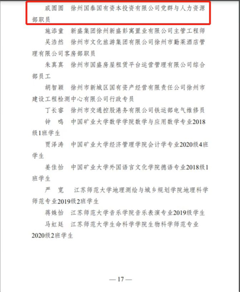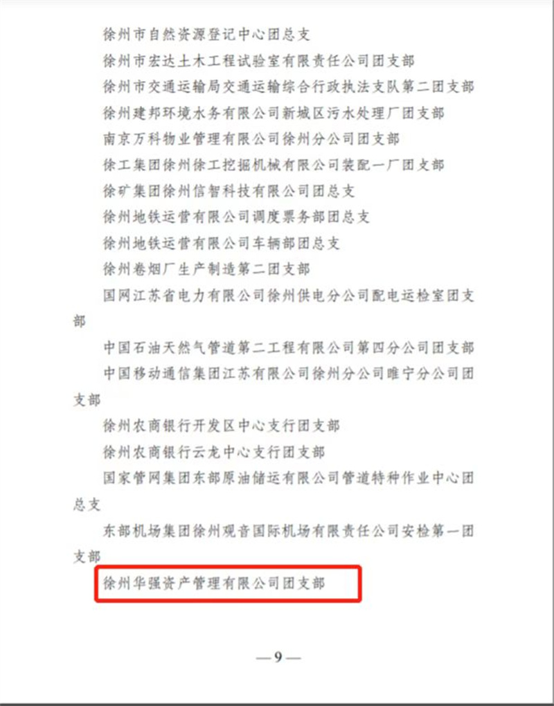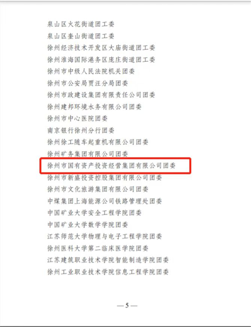 2022年是黨的二十大召開(kāi)之年,也是中國共青團成立100周年。近日,共青團徐州市委對各級團組織及個(gè)人作出表彰。其中,國投集團團委榮獲“五四紅旗團委”稱(chēng)號、華強資產(chǎn)公司團支部榮獲“五四紅旗團支部”稱(chēng)號,國泰投資公司戚圓圓同志榮獲“優(yōu)秀共青團員”稱(chēng)號。