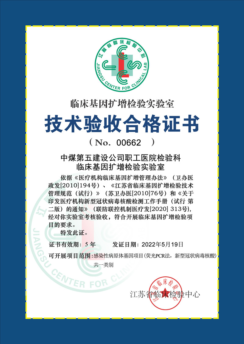5月19日江蘇省臨床檢驗中心頒發(fā)了《中煤第五建設公司職工醫院檢驗科臨床基因擴增檢驗實(shí)驗室技術(shù)驗收合格證書(shū)》(NO 00662)。中煤五建職工醫院將以此為契機,抓住機遇,創(chuàng )新發(fā)展,圍繞“完善質(zhì)控體系、提升醫療質(zhì)量、加強學(xué)科建設”的目標,全方位做好醫院各項工作,實(shí)現醫院發(fā)展再邁一個(gè)新臺階。