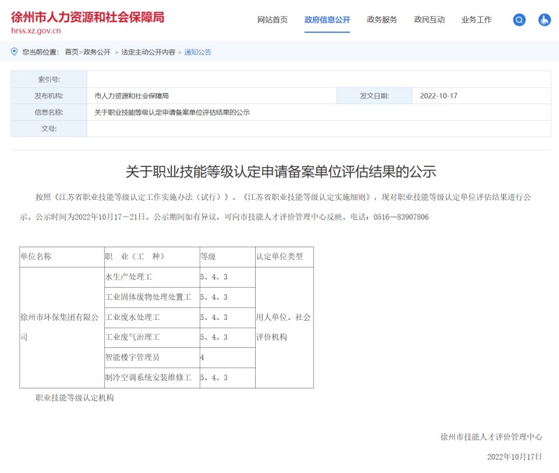 徐州市環(huán)保集團評價(jià)中心通過(guò)徐州市人力資源和社會(huì )保障局審批。按照《江蘇省職業(yè)技能等級認定工作實(shí)施辦法(試行)》《江蘇省職業(yè)技能等級認定實(shí)施細則》,徐州市環(huán)保集團有限公司成為水生產(chǎn)處理工、工業(yè)固體廢物處理處置工、工業(yè)廢水處理工、工業(yè)廢氣治理工、制冷空調系統安裝維修工的5、4、3級以及智能樓宇管理員4級的職業(yè)技能等級認定機構。