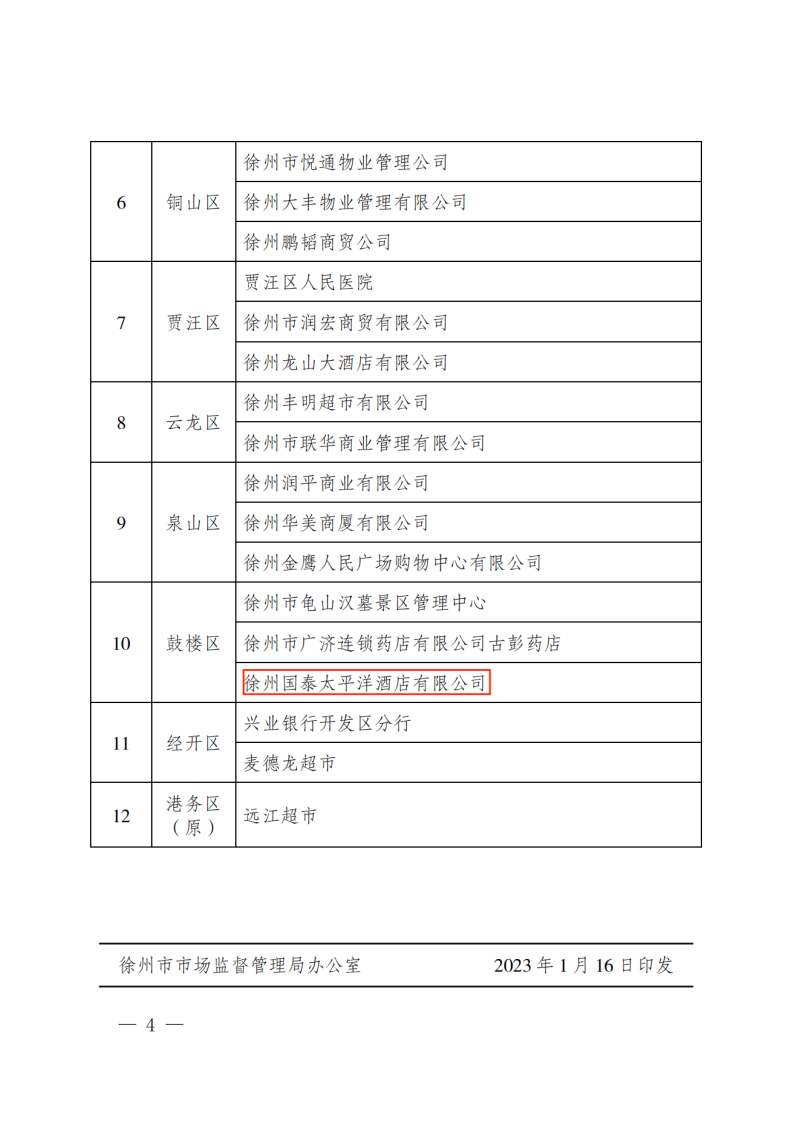 為深入推進(jìn)價(jià)格誠信建設,不斷規范和引導市場(chǎng)價(jià)格行為,培育誠實(shí)守信的市場(chǎng)主體。近日,經(jīng)過(guò)經(jīng)營(yíng)者自評、各縣(市)區市場(chǎng)監管部門(mén)初審推薦、徐州市市場(chǎng)監管部門(mén)現場(chǎng)核查評審等一系列程序,國泰太平洋酒店榮獲徐州市市場(chǎng)監督管理局“2022年度徐州市價(jià)格管理示范單位”榮譽(yù)稱(chēng)號。
