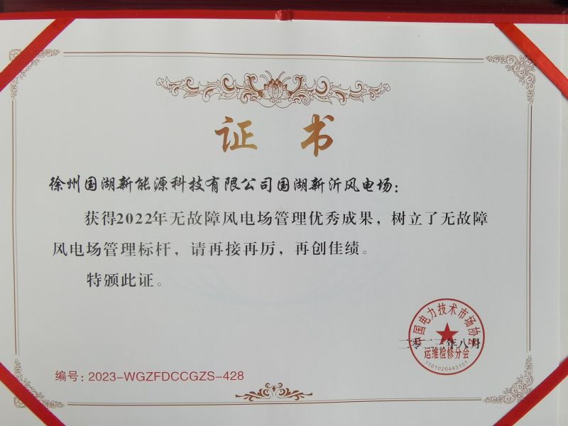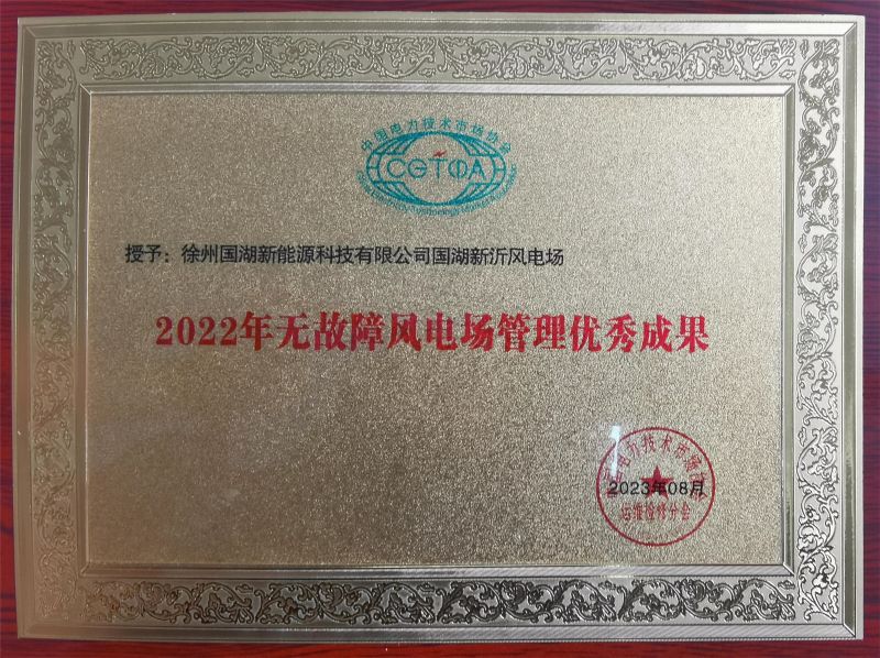 8月24日,徐州國湖新能源科技有限公司所屬?lài)乱曙L(fēng)電場(chǎng)榮獲中國電力技術(shù)市場(chǎng)協(xié)會(huì )頒發(fā)的“2022年無(wú)故障風(fēng)電場(chǎng)管理優(yōu)秀成果”獎項。