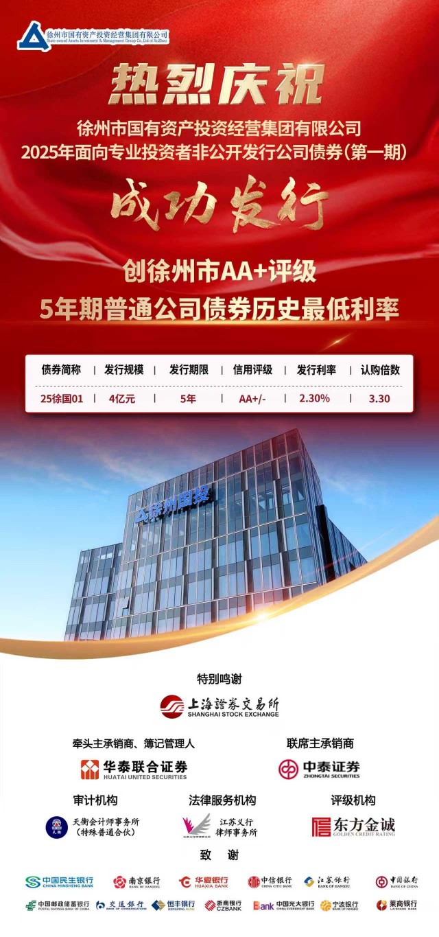 2025年10月31日,徐州國投集團成功發(fā)行面向專(zhuān)業(yè)投資者非公開(kāi)發(fā)行公司債券(第一期),發(fā)行利率2.30%,創(chuàng )下徐州市AA+評級5年期普通公司債券歷史最低發(fā)行利率紀錄。